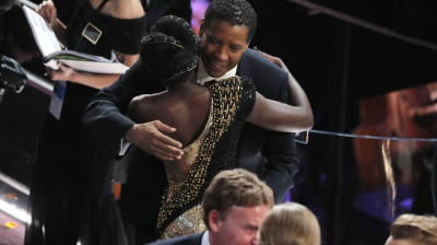 Denzel Washington, candidato al Oscar a Mejor Actor saluda a la actriz Lupita Nyong'o
