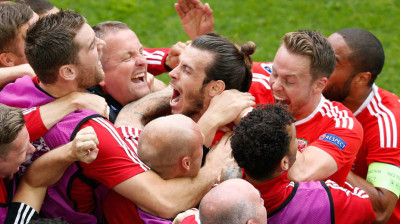 Bale, abrazado por sus compañeros, tras marcar el primer gol de Gales en una Eurocopa. REUTERS