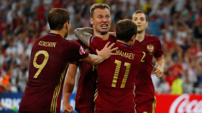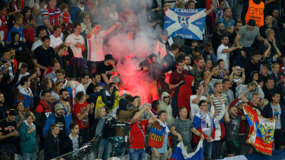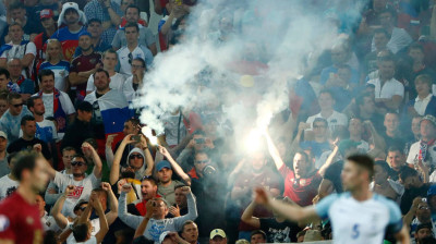 Algunos aficionados rusos exhibieron bengalas tras el gol de Glushakov. Reuters.