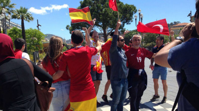 Buen rollo en las calles de Niza entre los aficionados turcos y españoles. Foto: Silvia Ortiz.