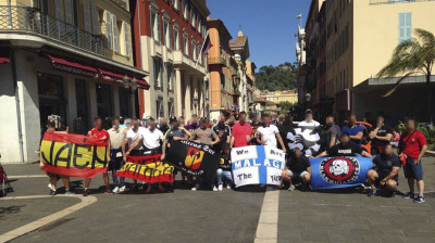 Miembros Ultras del Málaga, Jaén, Ultra Sur y de las Brigadas Blanquiazules del Espanyol se han juntado este viernes, en las horas previas al España-Turquía, en las calles de Niza, ciudad donde nuestra selección disputa el segundo partido de la Euroc
