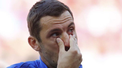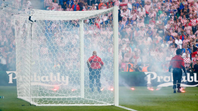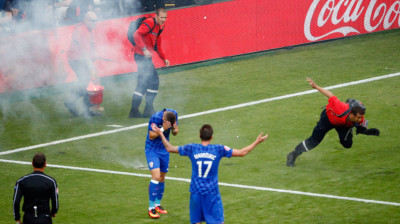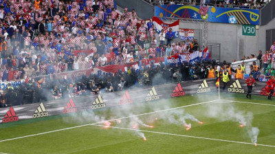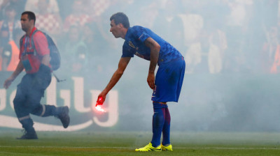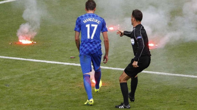 Mandzukic intenta apagar una de las bengalas lanzadas en Saint-Étienne (FOTO - Reuters)