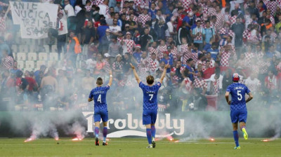 Los jugadores de Croacia acuden a sus aficionados tras el lanzamientos de bengalas (FOTO - Reuters)