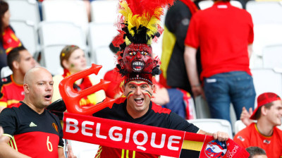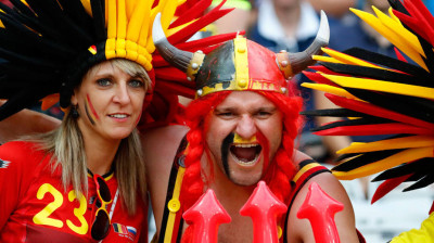 Aficionados belgas disfrazados antes del encuentro contra Hungría (FOTO - Reuters)