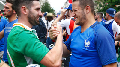 Un aficionado francés y otro irlandés se desean suerte en la Fan Zone de Lyon. Reuters.