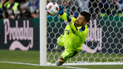 Buffon resbala durante la celebración de la victoria ante Bélgica (FOTO - Reuters)