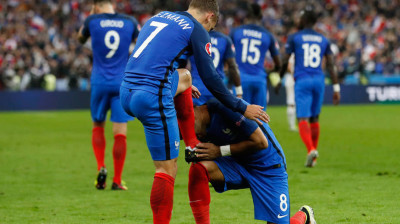 Payet, autor del tercer gol, besa la zapatilla de Griezmann, autor del cuarto gol de Francia ante Islandia (Reuters)