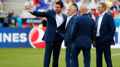 Deschamps, rodeado de su cuerpo técnico, comprueba el césped donde su selección se jugará la Eurocopa contra Francia (FOTO - Reuters)