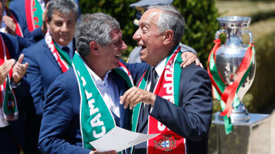 El presidente de Portugal felicitando a Santos por el triunfo de la selección. (Reuters)