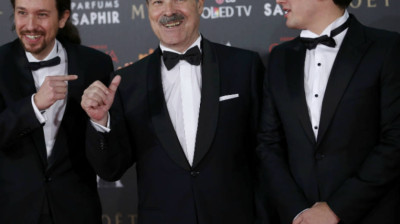 El presidente de la Academia de Cine, Antonio Resines (c), y los líderes de Podemos, Pablo Iglesias (i), y Ciudadanos, Albert Rivera. Reuters