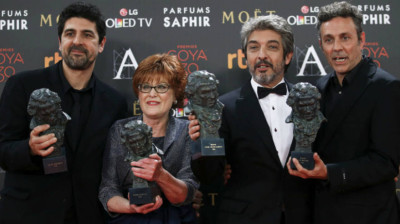 El realizador Cesc Gay, la productora Marta Esteban, el actor argentino Ricardo Darín y el guionista Tomás Aragay, posan con los Goyas conseguidos por sus trabajos en la película Truman, Reuters