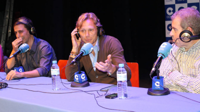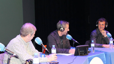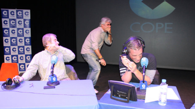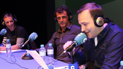 Tomás Guasch, Fernando Baquero y Joseba Larrañaga no pueden contener las carcajadas ante el show qie montó el Grupo Risa durante el debate de los jueves