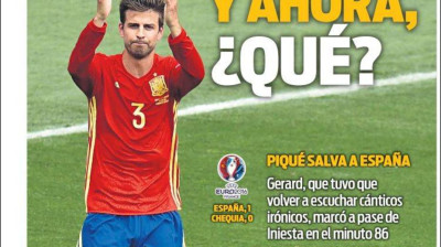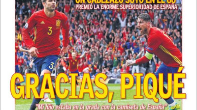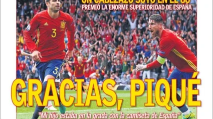 'Salvador' Piqué, protagonista en las portadas nacionalesRedacción digitalMadrid - Publicado el 14 jun 2016, 11:39 - Actualizado 22 may 2017, 23:211 min lecturaFacebookTwitterWhatsappTelegramEnviar por emailCopiar enlaceGracias Piqué, titula el diario AsEl Mundo tampoco se olvida de PiquéTitular breve en El País citando el gol de PiquéLa Razón habla de Piqué como héroe nacionalAgradecimientos a Piqué en la portada de MarcaGran Piqué titula El Mundo Deportivo e ilustra con una foto con su hijoIronía en la portada de Sport sobre la rivalidad Piqué y EspañaOptimismo en la portada de Superdeporte