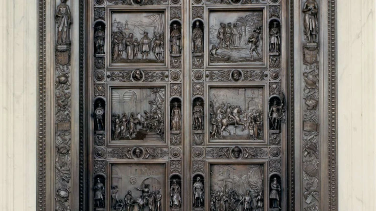 Una de las obras más llamativas que hacen referencia a Cristóbal Colón son las denominadas ‘Puertas de Colón’, obra del escultor americano Randolph Rogers y que en la actualidad se encuentran en el ala este del Capitolio. “En ellas podemos ver, a través de nueve escenas, de nueve grabados, la vida del almirante y bueno también en esas puertas ya no solo es la vida del propio Colón sino de personajes que le rodearon porque tenemos a los Reyes Católicos, tenemos personajes otra vez como Pizarro, tenemos imágenes del Consejo de Salamanca; bueno, al fin y al cabo la vida del propio Colón”.