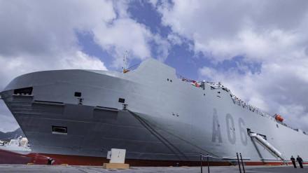 Puede transportar en sus seis cubiertas de carga más de un millar de vehículos militares y carros de combate