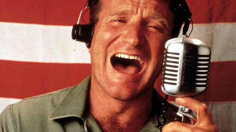 Good Morning, Vietnam, 1980er, 1980s, Film, Good Morning, Vietnam, Mikrophon, Radio moderator, Vietnam war, microphone, Good Morning, Vietnam, 1980er, 1980s, Film, Good Morning, Vietnam, Mikrophon, Radio moderator, Vietnam war, microphone, Robin Williams Sein langgezogenens "Gooooooood morning, Vietnammmm" wird zu seinem Markenzeichen. *** Local Caption *** 1987