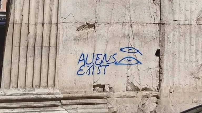 El Panteón de Roma apareció con una pintada en uno de sus muros centenarios en la que puede leerse "Aliens exist" (los alienígenas existen), lo que hoy causó la indignación mientras las autoridades buscan al autor de este acto vandálico.