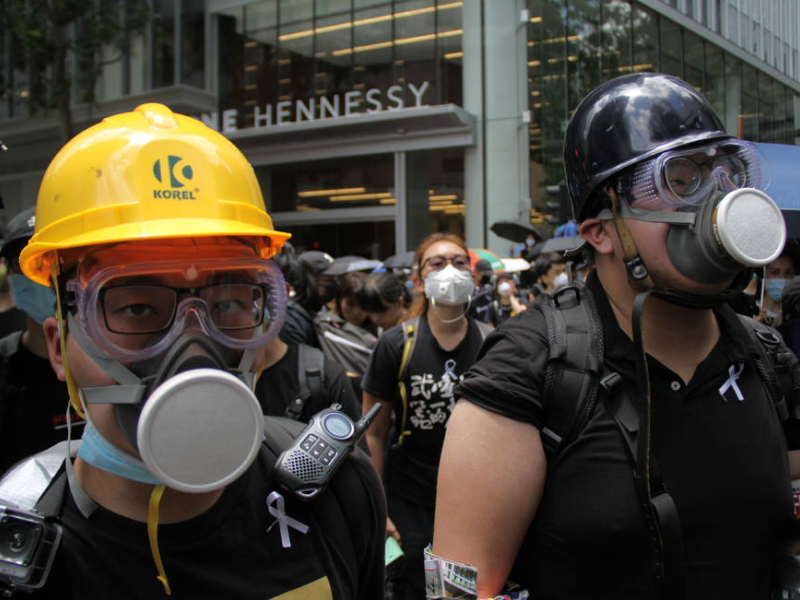 Pertrechados con camisetas negras y cascos amarillos, el uniforme de la revuelta, los manifestantes llevan gafas y máscaras para protegerse de los gases lacrimógenos y el espray de pimienta que lanzan los antidisturbios. Como escudo, blanden paraguas, símbolo de este movimiento pro-democrático que planta cara al autoritario régimen de Pekín.