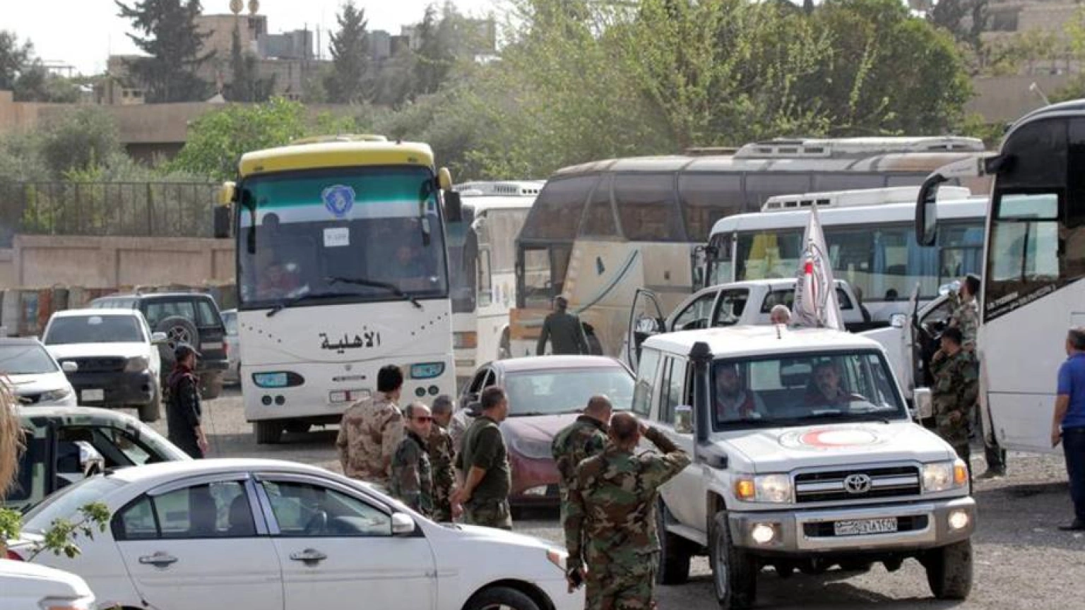 Combatientes del Ejército del Islam y sus familias son evacuados en autobús de Duma. EFE