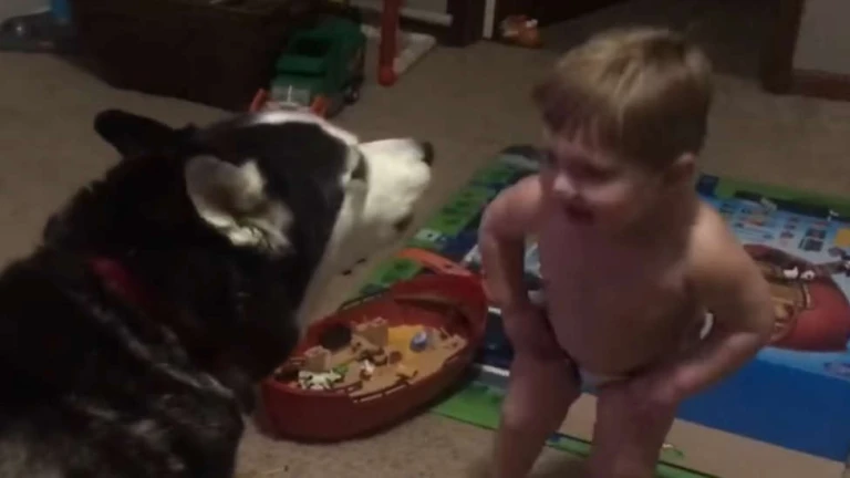 Un bebé se ríe de un perro y entonces pasa lo que él no esperaba