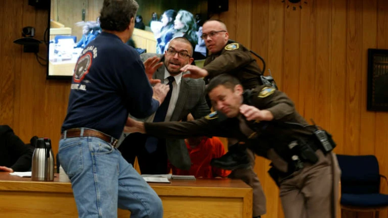 Randall Margraves, padre de 3 víctimas del exmédico Larry Nassar, intenta agredirlo en el juicio. REUTERS