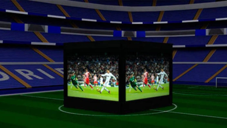 En el centro del césped ya se encuentra perfectamente montado un cubo con pantallas en sus cuatro lados de 50 metros por 50 metros aproximadamente