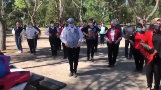 La pradera de San Isidro luce muy distinta a otros años. No hay puestos, no hay atracciones, pero algún nostálgico no ha querido perder la tradición de vestirse de chulapo y bailar unos chotis, eso sí, sin estar pegaos, como José Manuel y sus amigos del barrio. "El Chotis en línea lo hemos inventado nosotros para guardar las distancias de seguridad. Y, bueno, no nos sale mal", nos dice José Manuel