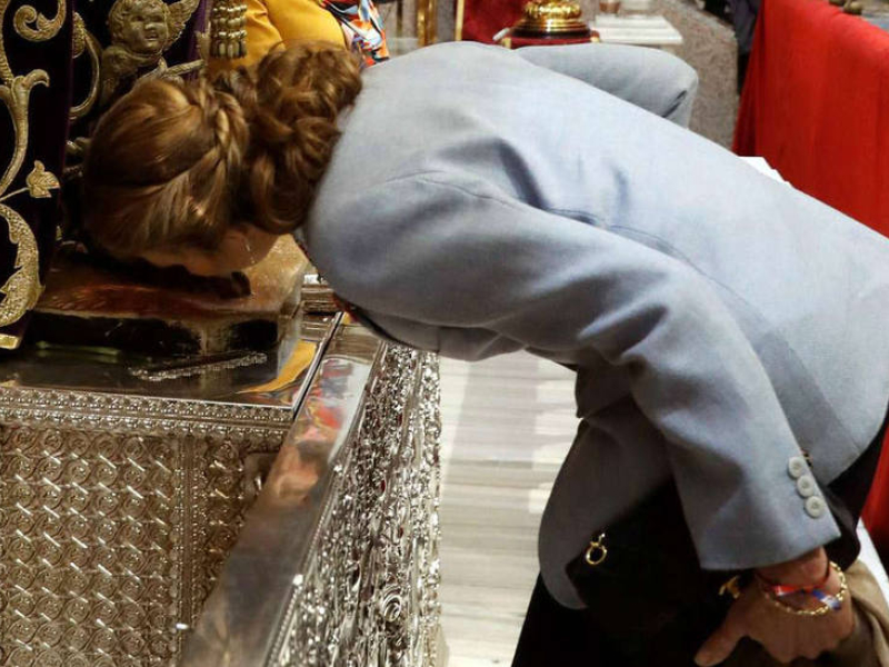 A su llegada a la iglesia doña Elena ha sido recibida con aplausos de los cientos de feligreses que en ese momento se encontraban en los alrededores del templo, muchos de ellos a punto de acceder a su interior para besar, como manda la costumbre, los pies de la imagen del Cristo y pedir tres deseos para que, según la creencia, se cumpla uno.