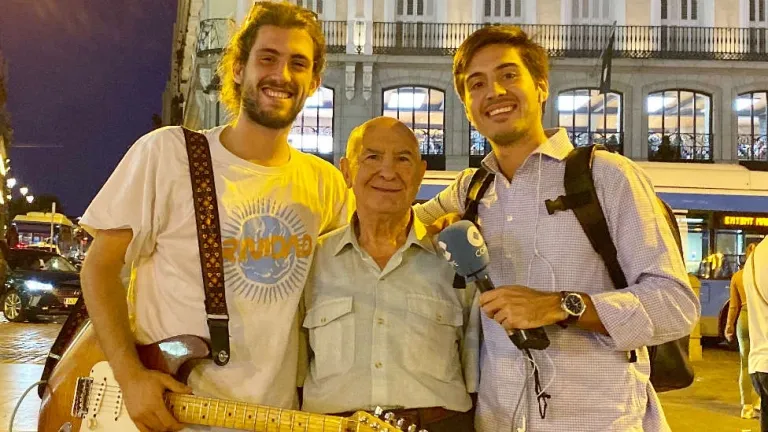 La positividad como bandera y unos acordes de blues les funde en un abrazo en la Puerta del Sol de Madrid. Un abrazo entre dos generaciones. Son Borja y Mariano, Mariano y Borja. Tocando y bailando. Les separan 63 años, toda una vida.