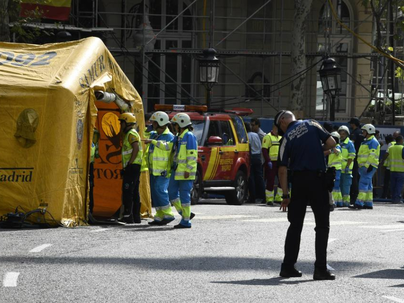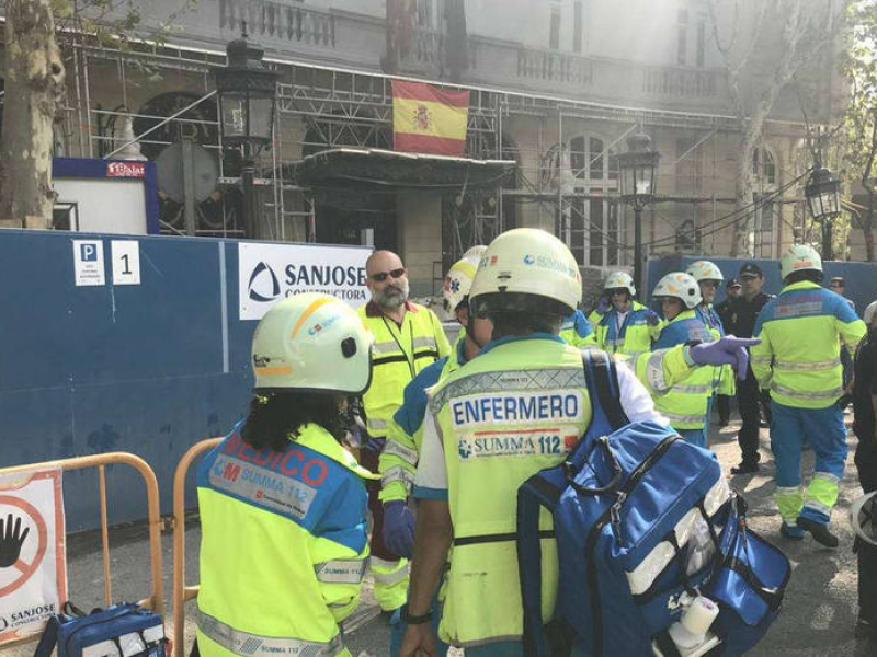 GRAF5616. MADRID, 18/09/2018.- Integrantes de los servicios de Emergencias en las inmediaciones del madrileño hotel Ritz, en cuyas obras se ha producido un derrumbe, por la caída de un forjado de la sexta planta del edificio, lo que ha provocado al menos cinco heridos. EFE/ Victor Lerena