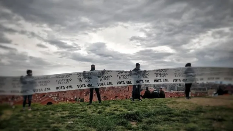 Una pancarta de un kilómetro en el vallecano 'Parque de las Tetas' (Madrid) alerta de que "quien vota fijo es tu vecino el pijo". Es la última acción de los activistas del movimiento #Defiéndete 4M, que busca la movilización del voto progresista en las elecciones a la Comunidad de Madrid.