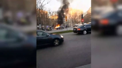 Coche ardiendo en la Puerta de Alcalá