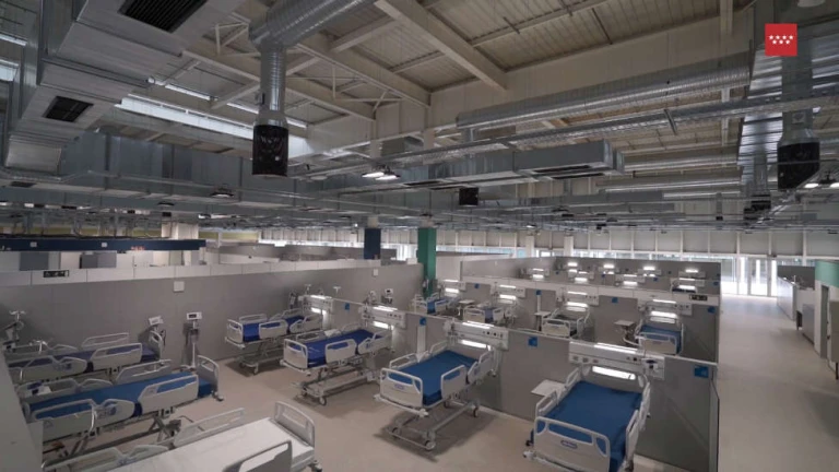 El vídeo que ha hecho público la Comunidad de Madrid demuestra lo contrario, pues cuenta con todo lo necesario para dar una adecuada atención médica. 80.000 metros cuadrados de superficie construida, cinco pabellones de los cuales tres son de hospitalización, con una superficie de 10.500 metros cuadrados cada uno, y capacidad para unos mil pacientes y 50 camas en la unidad de cuidados intensivos (UCI).