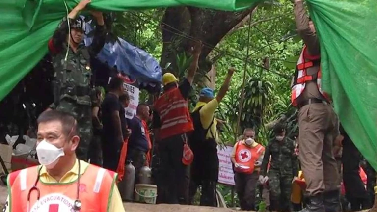 Comienza la operación de rescate. Un contingente internacional formado por 18 buzos se adentra en la caverna. Once horas más tarde,