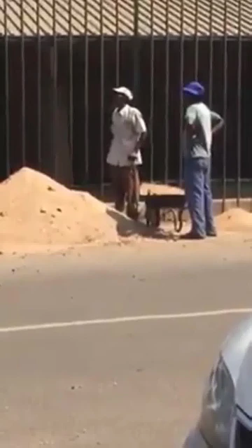 Vamos ahora con lo que podríamos llamar 'trabajo raro'. Porque muy productivo no parece. En resumidas cuentas: uno hace y el otro también, pero el resultado se puede lograr igualmente sin que los dos hagan, porque total, mover arena a una carretilla y vaciarla a menos de un metro es... absurdo.