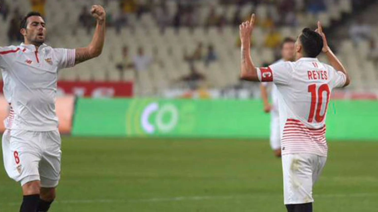 Reyes celebra el tanto anotado en el Olímpico de Atenas. (@SevillaFC)