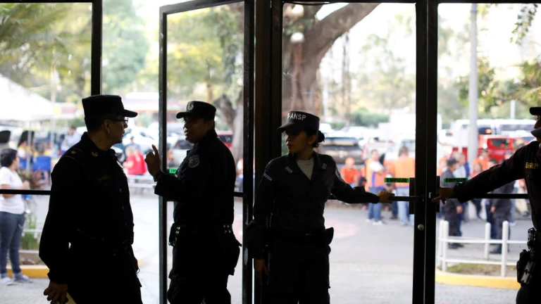 Salvadoran police officers close the doors of a voting center after closing a polling stations during the municipal and parliamentary elections in San Salvador