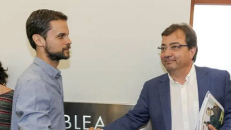 Guillermo Fernández Vara saluda a Álvaro Jaén, secretario general de Podemos Extremadura. EFE