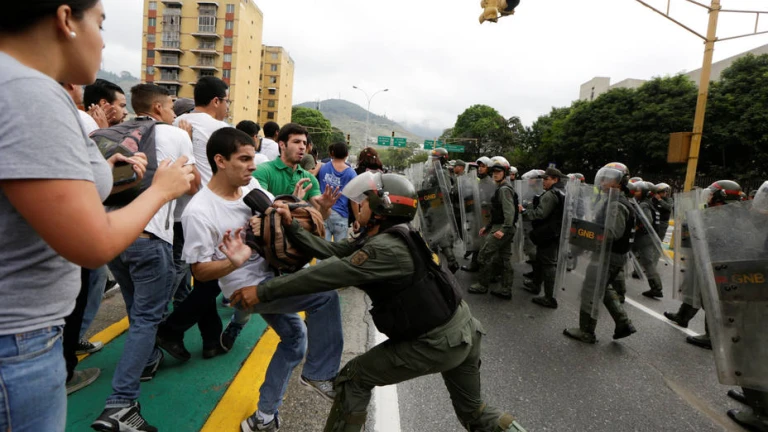 Opositores venezolanos se enfrentan la la Guardia Nacional en Caracas