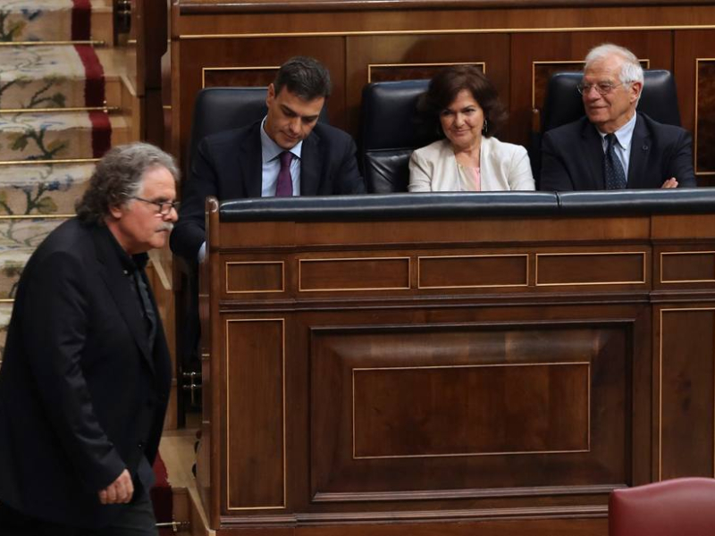 GRAF8519. MADRID, 27/06/2018.- El portavoz de ERC, Joan Tardà, pasa delante del escaño del presidente del Gobierno, Pedro Sánchez (sentado-i), junto a la vicepresidenta, Carmen Calvo (sentada-c) y el ministro de Asuntos Exteriores, Josep Borrell (sentado-d), durante el pleno del Congreso ante el que comparece el jefe del Ejecutivo, Pedro Sánchez, para informar de la posición que trasladará al primer Consejo Europeo al que asiste como jefe del Ejecutivo y que se inicia el jueves en Bruselas. EFE/Ballesteros