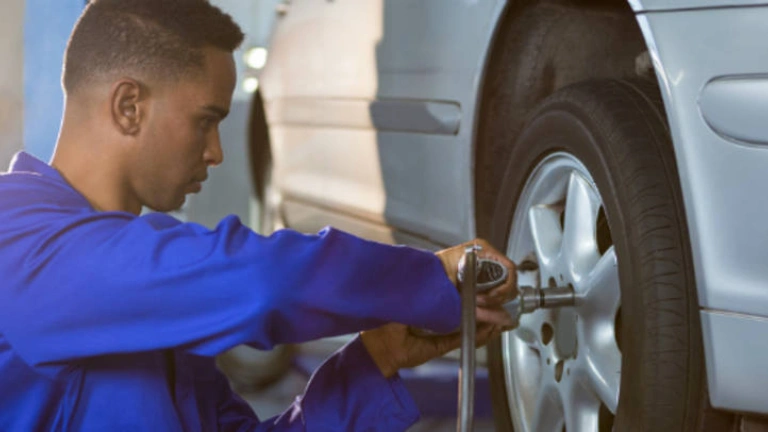 Un trabajador en un taller mecánico de coches. Foto de archivo