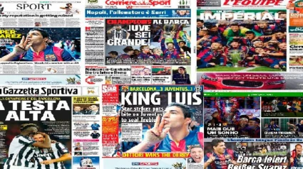 La prensa se hecho eco del triunfo del sábado del FC Barcelona ante la Juventus. "Tricampeones" es la palabra más utilizada por los medios catalanes, como Mundo Deportivo y Sport. Marca habla de una "Quinta de Oro", mientras que As titula "Ciclo renovado". La Vanguardia es el único rotativo nacional que abre con una portada más propia de los medios deportivos, ya que ocupa toda la página una gran foto de Messi besando el trofeo bajo el titular "El Barça de los prodigios". El Mundo y El País han escogido la foto de Xavi levantando la que es su último trofeo como culé bajo la que han puesto "Tres veces Barça" y "Barça conquista la Quinta", respectivamente. Por último, La Razón, que utiliza la misma fotografías que los dos periódicos anteriores, pero en menor tamaño, titula "Triplete para el Barça". Fuera de nuestras fronteras, la prensa brasileña destaca la actuación del atacante Neymar, uno de los protagonistas, ya que aportó un gol en la victoria por 3-1 sobre la Juventus de Turín, en la final disputada en Berlín."¡El Barça también es 'penta'!", ha titulado el diario deportivo Lance en su edición digital, en la que ha añadido: "Cinco brasileños en el elenco y cinco títulos de la Liga de Campeones. Neymar deja su marca y el Barcelona vence al Juventus en una gran final en Berlín". "¡Neymar y diez más! El Barça conquista Europa con toque brasileño. En la despedida de Xavi, en un escenario histórico, el equipo de Luis Enrique completa una temporada perfecta al derrotar a la Juventus en la final", ha resaltado el mismo diario.El portal Globoesporte, por su parte, también ha reconocido la labor de Neymar. "El brasileño marca en la última jugada, iguala a Messi y Cristiano Ronaldo en la artillería de la competencia y el Barcelona conquista en Berlín su quinto título".La prensa deportiva francesa habla de un Barça “Imperial”, tal y como aparece en la portada de L’Equipe, que ensalza la labor de Messi en la final. “No ha encontrado la red, lo cual es bastante raro, pero gracias a él brillaron sus compañeros”. Asimismo, ha destacado que el Barça ha "entrado en la leyenda" con la victoria en la final de la Liga de Campeones ante el Juventus (1-3), que le convirtió en el primer equipo en conseguir dos tripletes (Liga, Copa y Liga de Campeones) en la historia del fútbol europeo. "La coronación de una dinastía", señala el diario deportivo, para quien el equipo catalán se hizo con una final "incierta y magnífica", en la que "la Juve estuvo cerca de hacer vacilar al mejor equipo de la década".Le Parisien también alaba el juego de la plantilla de Luis Enrique, en especial el primer tanto blaugrana, que tacha de “obra maestra de 55 segundos”. "Seguir de cerca los movimientos del Barça, es mirar a un gran compositor escribir en la partitura cada nota de una sinfonía. Un inmenso privilegio", añade el semanal Le Journal du Dimanche.Si Brasil ha apuntado la importancia de Neymar y Francia la de Messi, los ingleses señalan que la figura del partido fue un exjugador de la Premier: Suárez. Así, The Telegraph titula “Súper Suárez”, mientras que el Daily Star habla del “Rey Luis”. The Guardian, dice en su web que “El gol de Luis Suárez premia el dominio de Barcelona para romper la Juventus”. “Vinieron en busca de lo que Gerard Piqué llama perfección y, una vez más, dejaron la clara sensación de que este es el equipo que tiene el fútbol a sus niveles más altos”, ha escrito el medio inglés.La prensa alemana ha destacado la figura de Ter Stegen, al que llaman "nuestro rey de Europa" en la edición digital del Bild. El rotativo titula “El Barça celebra. Suárez mordedor”. Por otro lado, el diario Süddeutsche Zeitung titula con la "Corona para el tridente" y señala que "Messi prepara" mientras "Suárez y Neymar deciden el juego". "Xavi, rey de Cataluña. Messi, gobernador del mundo", ha escrito en su portada Sport Express, el diario deportivo más importante de Rusia, que subraya además el dominio del Barca durante los últimos años y las cinco copas de la máxima competición europea que acumula. Los medios italianos, por su parte, piden a la Juventus que no agachen la cabeza. "La cabeza alta", titula La Gazzetta en su portada, en la que aparece la imagen de Pogba consolando a Pirlo. En su interior, en la editorial, el periódico agradece al equipo lo logrado este año. "Sois grandes", dice Corriere dello Sport.