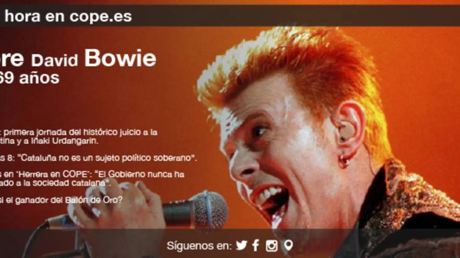 El legendario músico británico David Bowie, autor de clásicos como "Starman" y "Space Oddity", ha muerto a los 69 años de cáncer, tal y como han informado en su página de Facebook. Según este mensaje, el artista, que popularizó el "glam rock" en los años 70 y 80, falleció este domingo "serenamente, rodeado de su familia, tras una valiente batalla de 18 meses contra el cáncer". "Aunque muchos de vosotros compartiréis con nosotros esta pérdida, pedimos respeto a la privacidad de la familia durante el duelo", añade la nota, a la que dirigía también el Twitter oficial de Bowie. Su hijo, el cineasta Duncan Jones, confirmó por su parte la noticia en la red social. "Lamento mucho decir que es verdad. Estaré desconectado una temporada. Mucho amor para todos", escribió.
