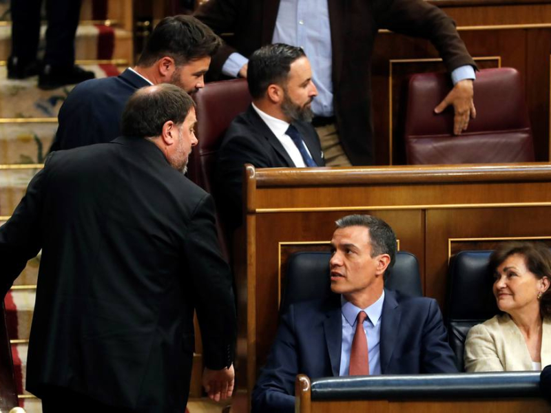 GRAF5434 MADRID, 21/5/2019.- El líder de ERC, Oriol Junqueras,iz., que se encuentra en prisión provisional se dirige al presidente del Gobierno en funciones, Pedro Sánchez,d., durante la sesión constitutiva de las nuevas Cortes Generales de la XIII Legislativa que se celebra este martes en el Congreso de los Diputados. EFE/Ballestros