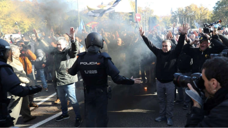 Los antidisturbios cargan contra los manifestantes tras lanzar un grupo de ellos bombas de humo y zarandear las vallas que protegían el Congreso