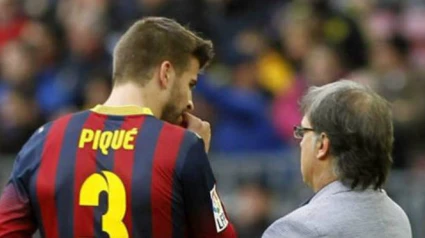 El entrenador del F.C.Barcelona, Gerardo Tata Martino, da instrucciones al defensa Gerard Pique. EFE