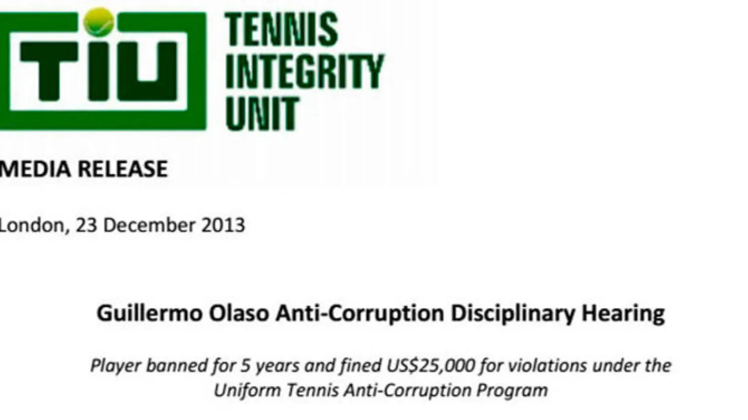 Hoy 23 de diciembre del 2013 el árbitro Richard McLaren ha comunicado la decisión de imponerme una sanción en base al Uniform Tennis Anti-Corruption Program por un periodo de tres años y medio, un curso formativo contra la corrupción, y una multa de 25 mil dólares. Ante esta decisión debo aclarar: