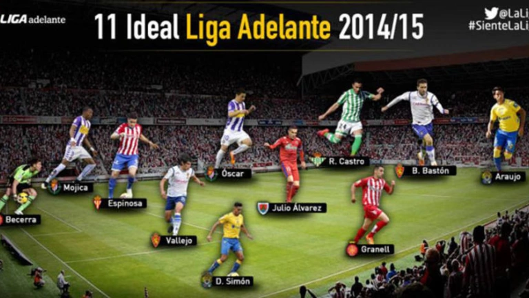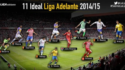 Las Palmas, Girona, Zaragoza y Valladolid aportan dos jugadores al once ideal de la Liga Adelante 2014/15 elegido por los redactores de la web de la LFP, que está dirigido por el técnico del Sporting, Abelardo Fernández. El conjunto asturiano cuenta con el central Bernardo Espinosa, el Betis, campeón de la temporada, con el máximo artillero, Rubén Castro, y el Numancia es el único equipo que no alcanzó la promoción que figura en dicha relación gracias al medio venezolano Julio Álvarez. Composición del once ideal de la temporada: Portero: Isaac Becerra (Girona). Defensas: David Simón (Las Palmas), Bernardo Espinosa (Sporting), Jesús Vallejo (Zaragoza) y Johan Mojica (Valladolid). Medios: Óscar González (Valladolid), Julio Álvarez (Numancia), Álex Granell (Girona). Delanteros: Rubén Castro (Betis), Sergio Araujo (Las Palmas), Borja Bastón (Zaragoza). Entrenador: Abelardo Fernández (Sporting).