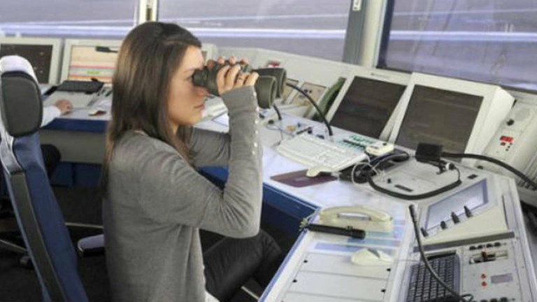 Una controladora de tráfico aéreo usa unos prismáticos desde la torre de control del aeropuerto de Bremen (Alemania). EFE