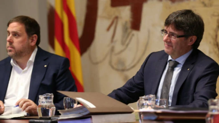 El presidente de la Generalitat, Carles Puigdemont, y su vicepresidente, Oriol Junqueras, durante la reunión semanal del gobierno catalán. EFE